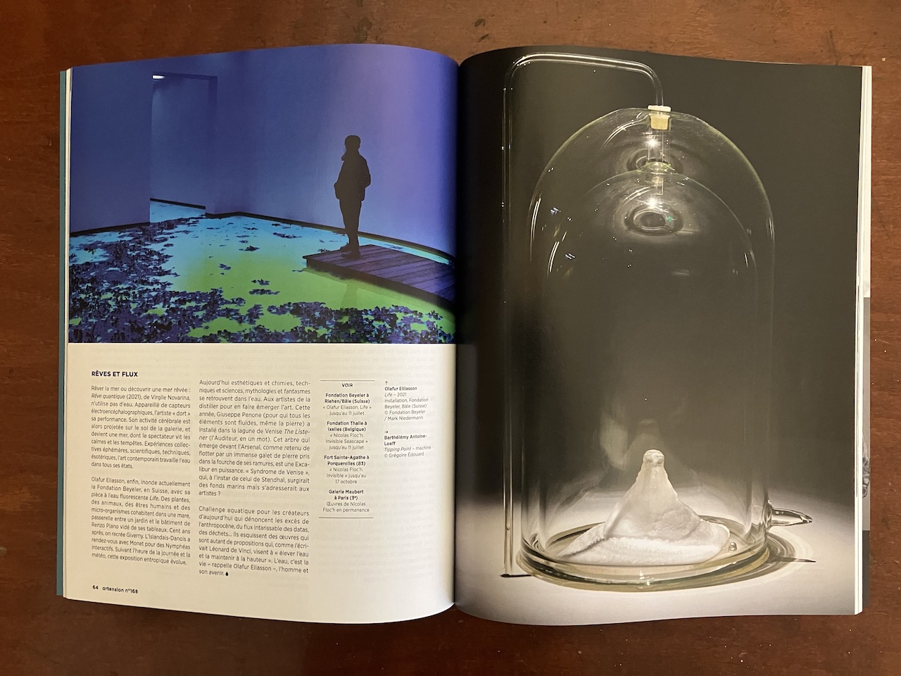 “Plusieurs d’entre [ces œuvres] dénoncent avec force les désordres climatiques en cours, à l’image de « Tipping point » (point de bascule), une œuvre de Barthélémy Antoine-Loeff pensée comme un hommage au glacier islandais Okjökull, disparu en 2014. L’artiste a mis sous cloche un mini glacier artificiel, alimenté par une goutte à chaque heure. « La lenteur du dispositif souligne le temps qu’il a fallu pour que naisse la cryosphère, si menacée aujourd’hui », explique le plasticien.”