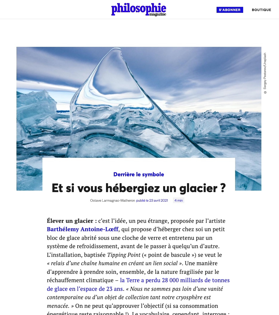 “Tipping Point, c’est justement le titre de l’œuvre de Barthélémy Antoine Loeff, qui recrée sous une cloche de verre la naissance d’un glacier artificiel, alimenté au goutte à goutte. [...] Créée en hommage au glacier islandais Okjökull éteint en 2014, son œuvre souligne avec poésie le tragique de la situation : puisque la stabilisation des glaciers à leur niveau actuel, à la fin de la dernière période glaciaire, remonte à environ 10 000 ans et coïncide à peu près avec l’apparition du premier homme en Mésopotamie, quelles peuvent-être les conséquences de leur extinction sur l’espèce humaine ?”